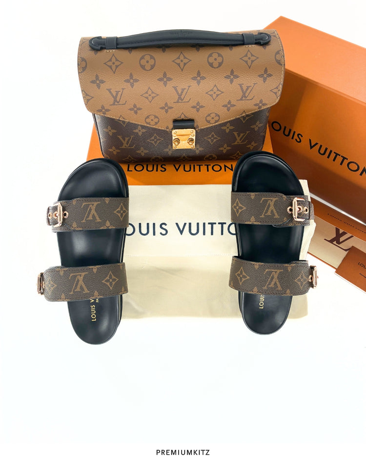 This Kit Includes The Following 2 items. Louis Vuitton Bom Dia Flat Comfort Mule (Sandal), Louis Vuitton Pochette Métis Monogram Reverse(Handbag)