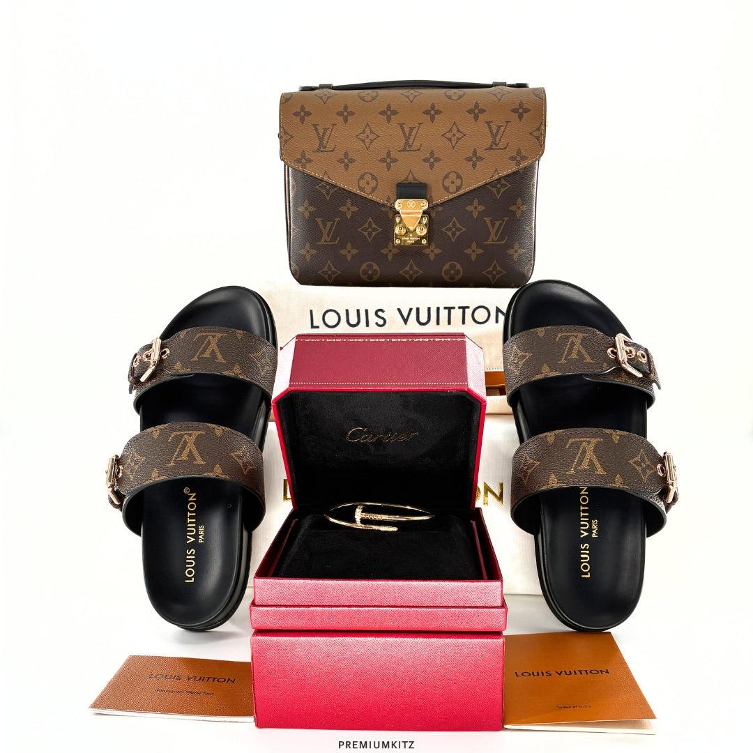 This Kit Includes The Following items. Cartier Juste un Clou bracelet, small model, diamonds ,Bom Dia Flat Comfort Mule (Sandal), Louis Vuitton Pochette Métis Monogram Reverse(Handbag)
