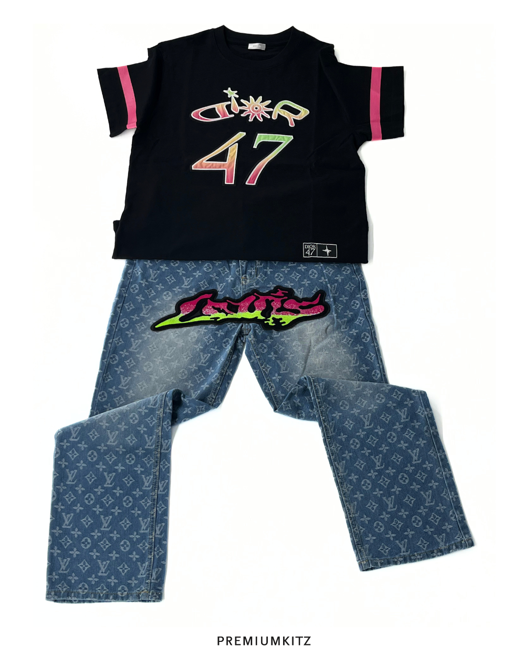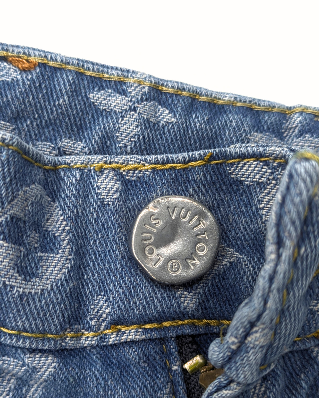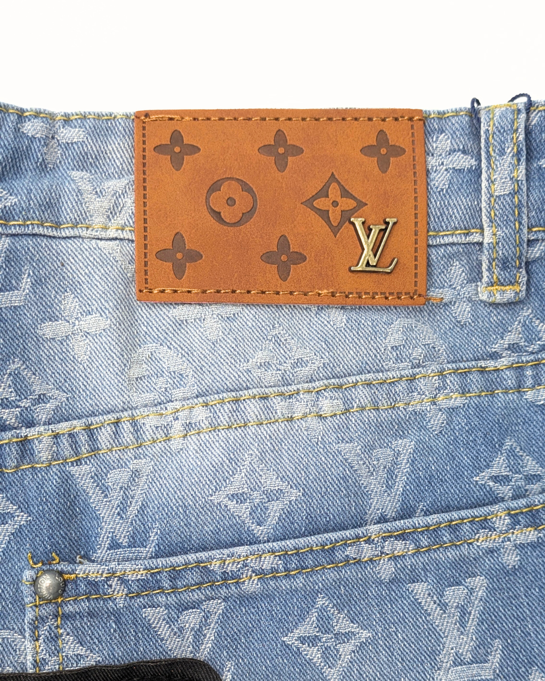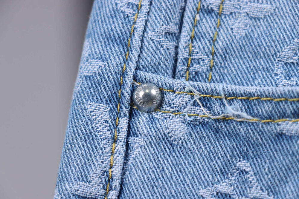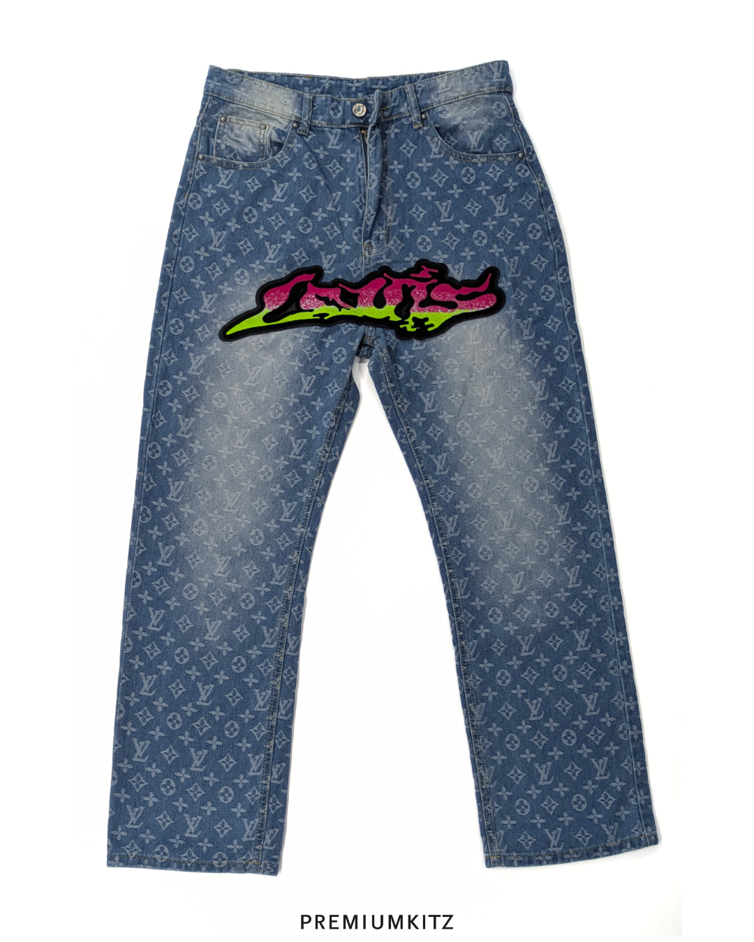 These are Louis Vuitton jeans designed by Virgil Abloh, featuring the iconic monogram pattern with a graffiti-style twist. The back of the jeans showcases bold, colorful graffiti lettering, adding a vibrant, streetwear-inspired element to the luxury piece. The design blends high-end fashion with an urban, contemporary aesthetic, characteristic of Abloh's unique approach to blending luxury with street culture. The jeans also feature a classic Louis Vuitton leather patch on the waistband, emphasizing their premium quality.