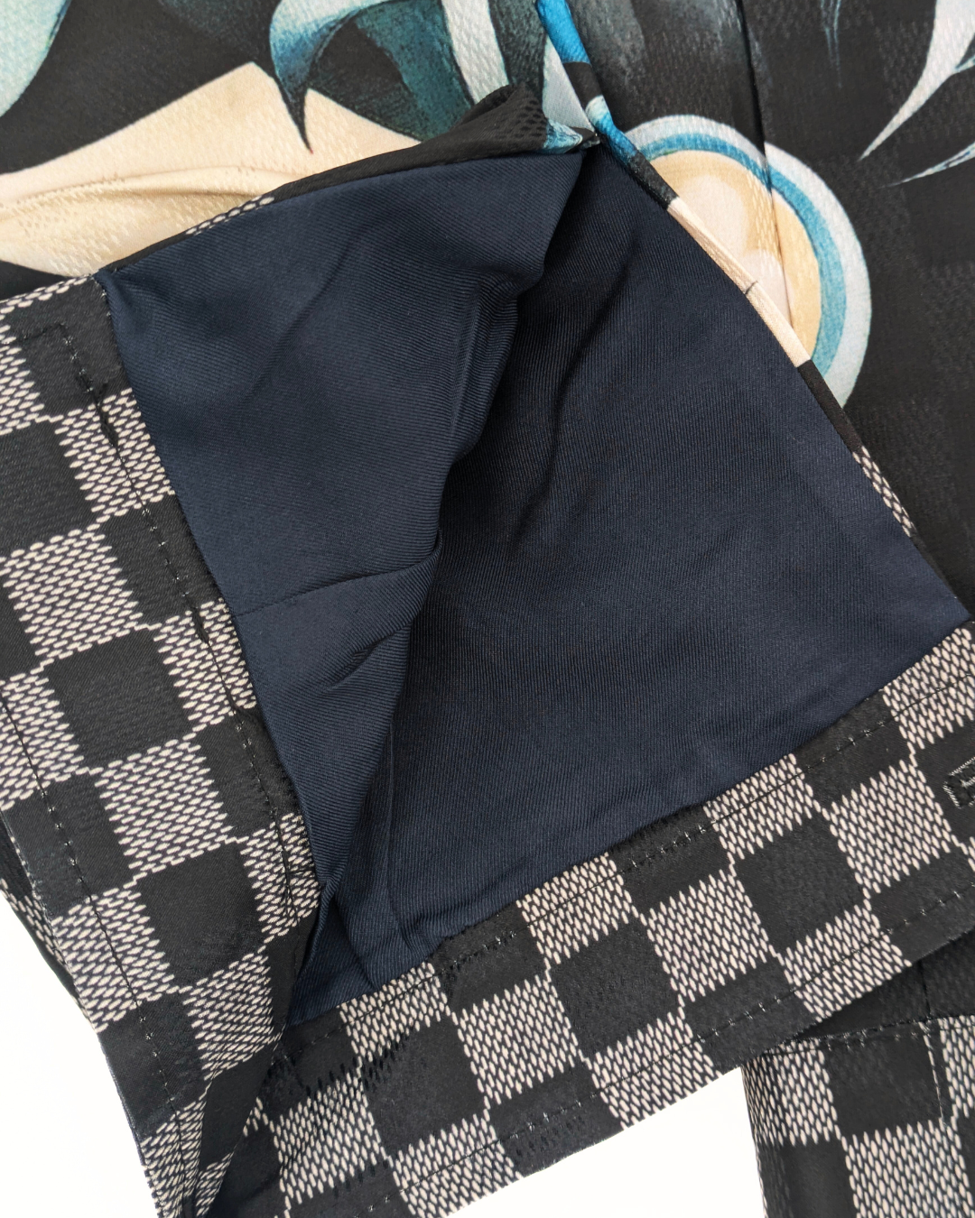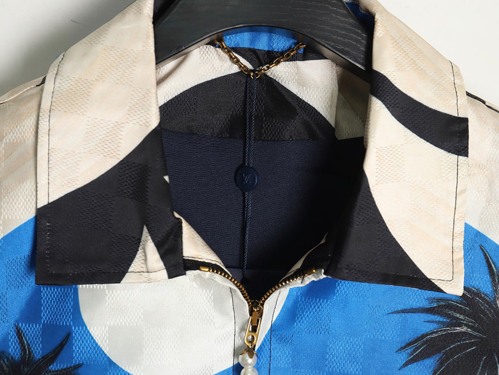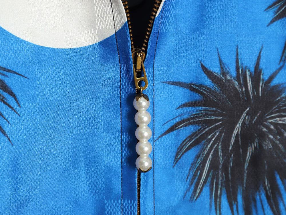 This chic printed blouson is perfect for an evening waterfront stroll. A lustrous Damier jacquard incorporating ‘Marque L.Vuitton déposée’ signatures forms the canvas for an allover Damier Pacific print depicting a moonlit beach in vibrant blue tones. Signatures include Monogram Flowers and a smart Damier trim, while a pearl-embellished puller on the zip closure adds a sophisticated final touch.